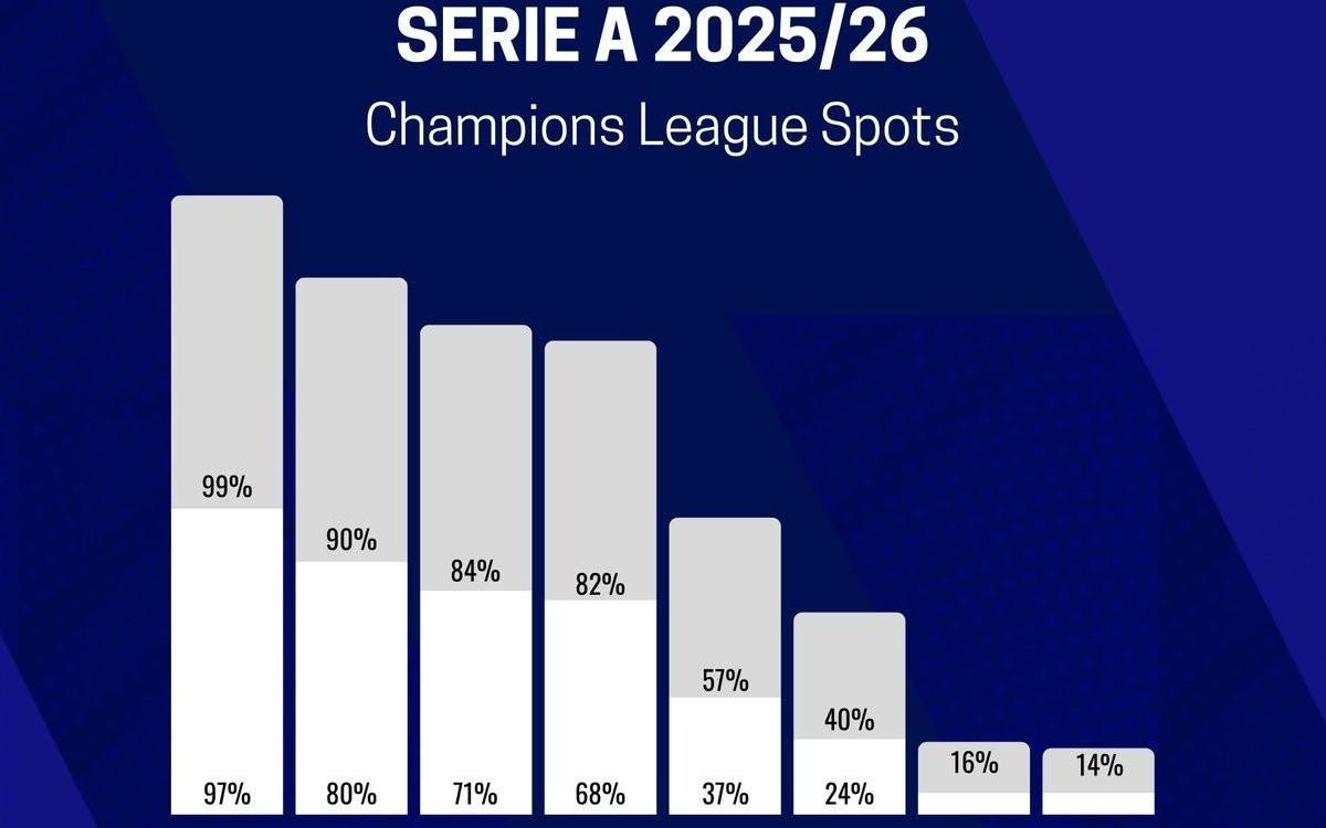 意甲前四名概率预测:国米97%最高,米兰68%,尤文仅37%