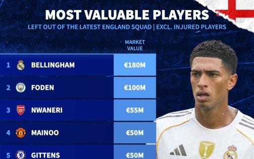 落选新一期英格兰大名单球员身价榜:贝林厄姆居首、福登第二