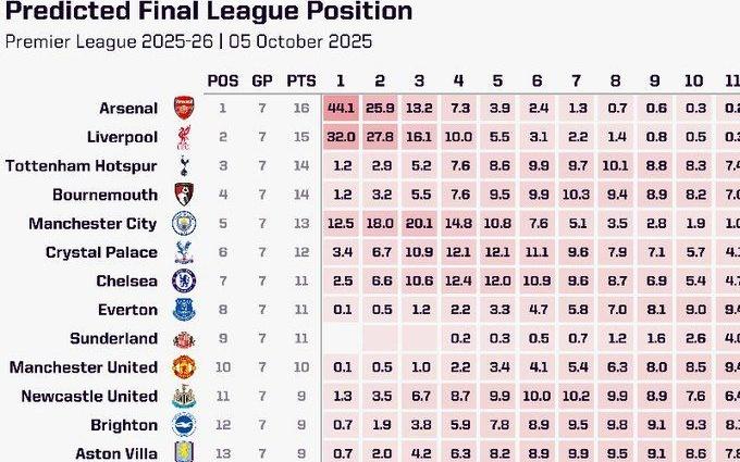 超级计算机预测英超:阿森纳夺冠概率44.1%升至第一