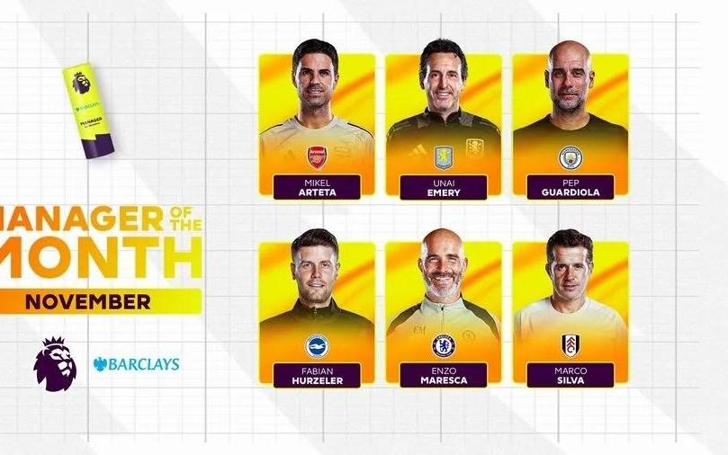 英超11月最佳主帅候选:马雷斯卡、瓜帅、塔帅、埃梅里在列