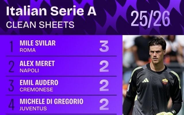 2025年24场意甲联赛斯维拉尔有14场零封,比其他门将至少多3场