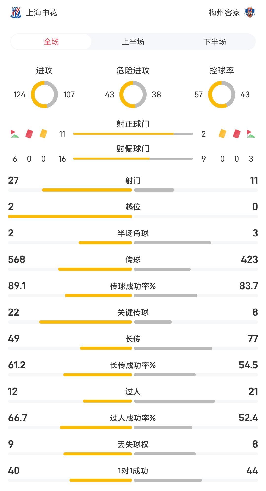 申花61梅州全场数据:申花狂轰27脚射门,控球率57