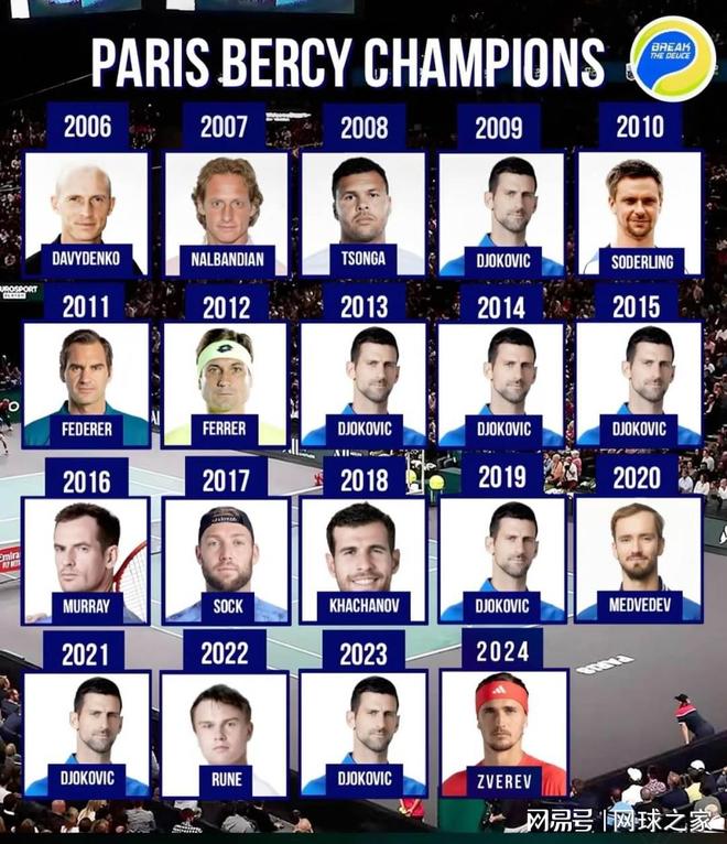 那么在巴黎大师赛历史上的冠军们,又都是哪些人呢?历史上最为成功的选手自然是德约了。今年并没有参赛的他,在多项赛事纪录上都榜上有名,其中就包括七次赛会冠军。就德约这位纪录收割机来说,“霉杯”的概念其实并不存在。