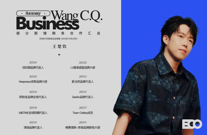 对应地,樊振东、王楚钦等人的品类合作也有精准化倾向。其中,樊振东代言除大众消费品外,更多见于科技、汽车等突出体现「实力」「可靠」气质的品类;王楚钦则因其新生代、充满活力的形象,成为LV(LOUIS VUITTON)、Oakley等时尚、运动品牌的宠儿。