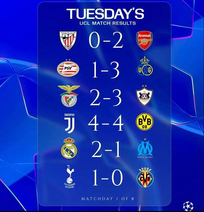 欧冠首日:皇马阿森纳热刺取胜,尤文多特进球大战