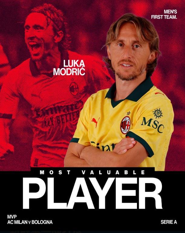 意甲第3轮,米兰1-0击败博洛尼亚,40岁莫德里奇打入全场比赛唯一一粒进球,除此之外,他还贡献2次关键传球、2次拦截、4次抢断等数据。在米兰官方队内最佳球员评选中,莫德里奇成功当选。