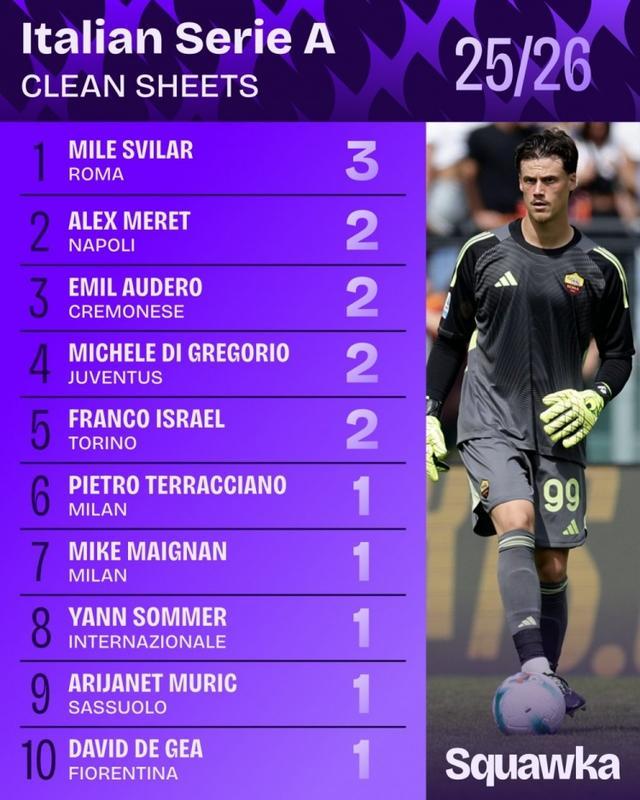 在本赛季的意甲联赛中,斯维拉尔已经3次零封对手,排名第一。