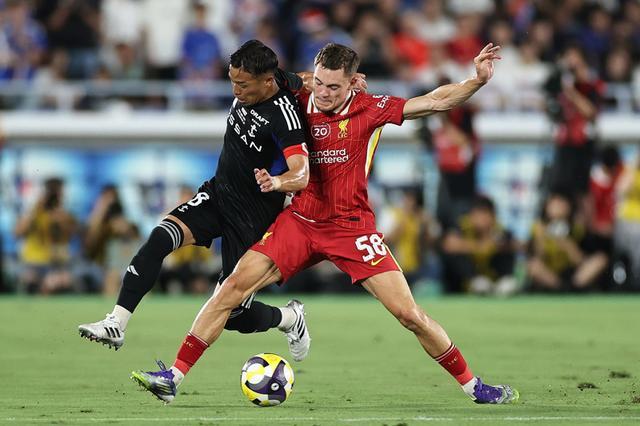 7月30日,利物浦队球员维尔茨(右)与横滨水手队球员喜田拓也在比赛中拼抢。 当日,在日本横滨举行的友谊赛中,英超利物浦队3比1战胜日本J联赛横滨水手队。 新华社记者 贾浩成 摄