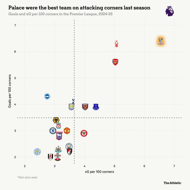 如果从每次角球创造的机会均等化来看——这种统计方式能为所有球队提供公平的竞争环境,毕竟有些球队可能获得的角球数更多——水晶宫在2024-25赛季的每100次角球预期进球数(xG)达到6.6,实际进球数为6.4,两项数据均位列英超第一。