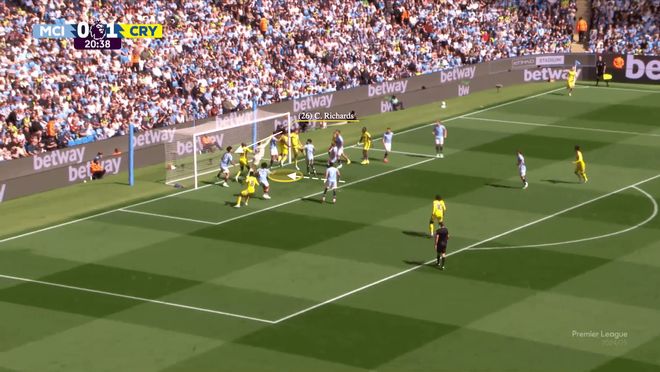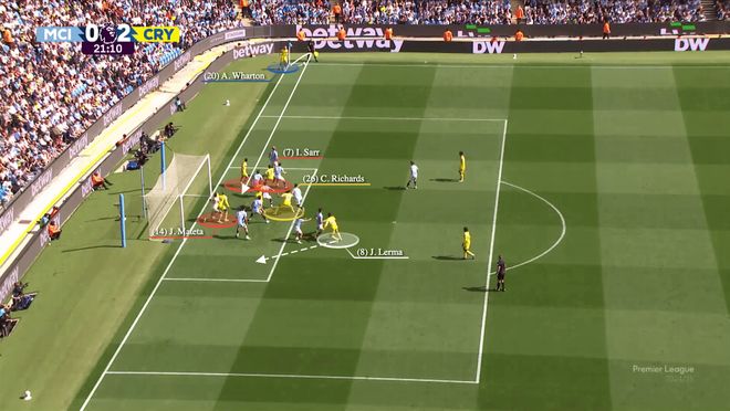 这样一来,沃顿精准地将球传入了空出的区域。同时,理查兹(黄色)摆脱了京多安的盯防,并迅速攻入该区域,打入了水晶宫本场比赛的第二粒进球。