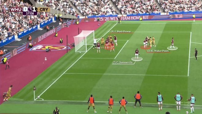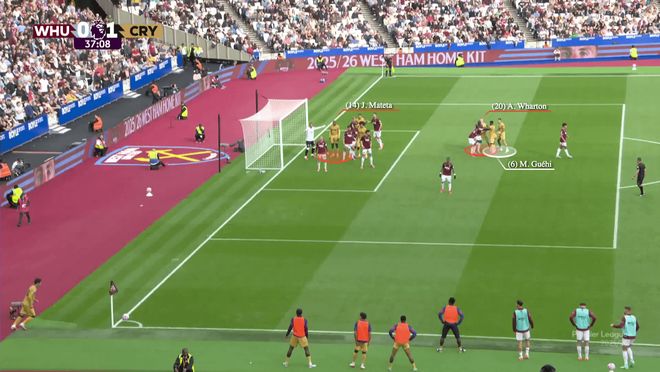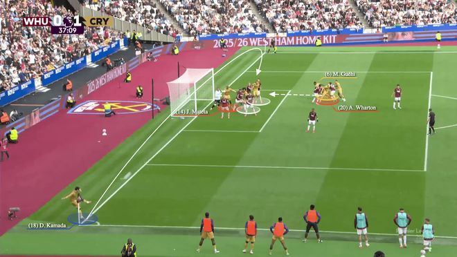 通过这种方式,水晶宫清空了后点,让格伊可以自由跑动,因为沃顿挡住了他的盯防者迪乌夫。