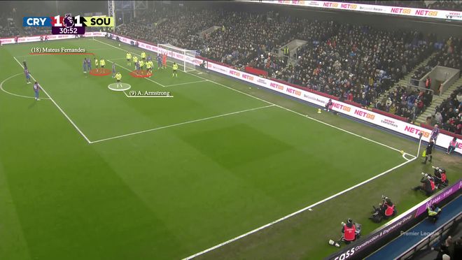 以下图为例,这是去年12月2-1战胜南安普顿的比赛场景。对手采用三名盯人防守球员(红色),亚当-阿姆斯特朗(白色)负责保护短传选项,六名区域防守球员分布在小禁区内。