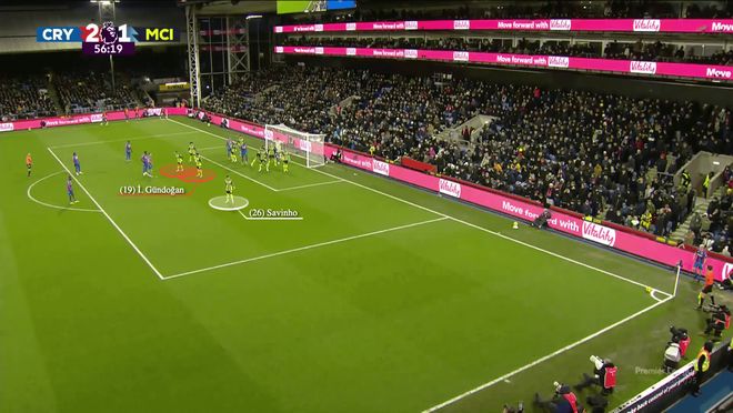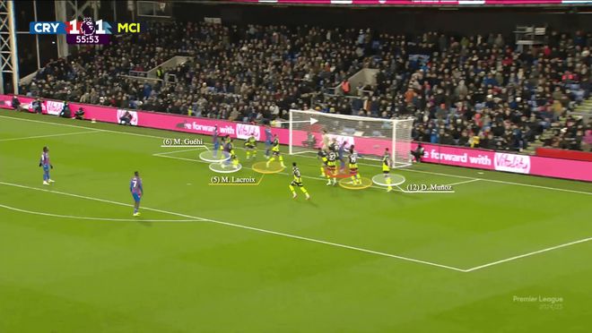沃顿瞄准前点区域的传中得到了马特塔、穆尼奥斯和伊斯梅拉-萨尔(红色)的配合。水晶宫的中锋马特塔牵制住了埃德森,而穆尼奥斯和萨尔则挡住了德布劳内与科瓦契奇,这两人正是前点的第一道防线。