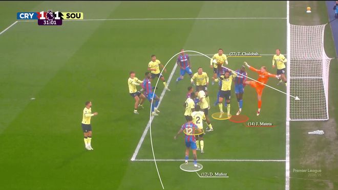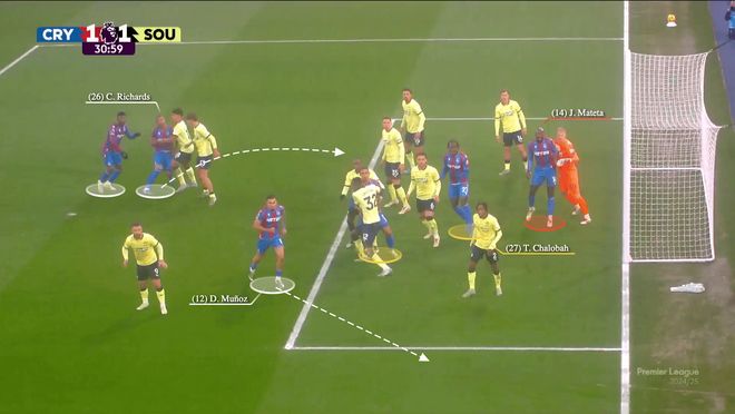 当威尔-休斯准备开出角球时,理查兹向后点移动,穆尼奥斯则冲向前点占据沃克-彼得斯的位置。然而,这次战术中最关键的角色是马特塔,他负责挡住拉姆斯代尔。