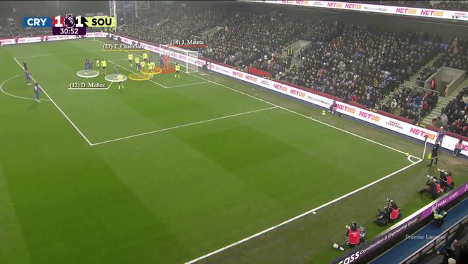 水晶宫的站位相对传统:禁区外有三名球员负责防反击(蒂里克-米切尔未入镜),跑位球员包括理查兹、莱尔马和穆尼奥斯(白色),特雷沃-查洛巴和拉克鲁瓦是主要目标点(黄色),而马特塔则站在门将身前(红色)。