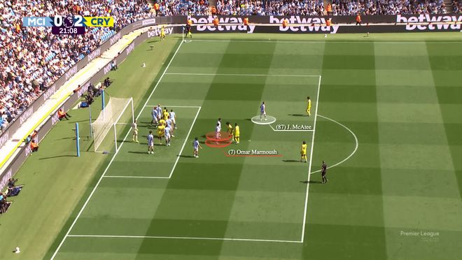 当威尔-休斯将球传向拉克鲁瓦时,马特塔(红色)干扰了曼城的中路区域防守球员鲁本-迪亚斯,其余水晶宫进攻球员则分散到禁区内的不同区域。