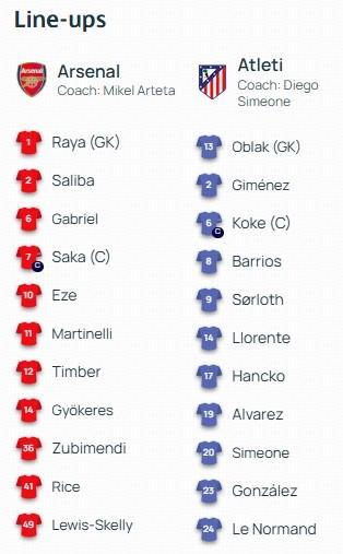 马竞首发:13-奥布拉克、2-希门尼斯、6-科克、8-巴里奥斯、9-瑟洛特、14-马科斯-略伦特、17-汉茨科、19-阿尔瓦雷斯、20-朱利亚诺-西蒙尼、23-尼古拉斯-冈萨雷斯、24-勒诺尔芒