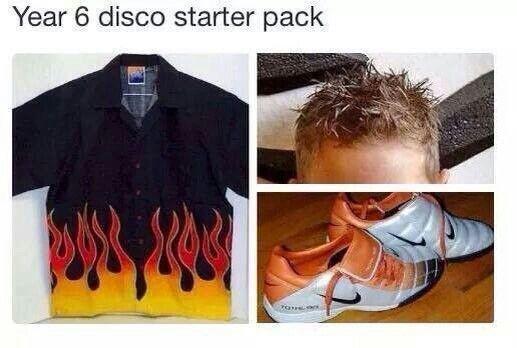 据报道,社交媒体上流传着一个关于“六年级迪斯科入门套装”的热门梗图,图中人物穿着一件下摆周围有一圈火焰图案的黑色衬衫、一双Total 90人造草皮运动鞋以及竖起的刺猬头。