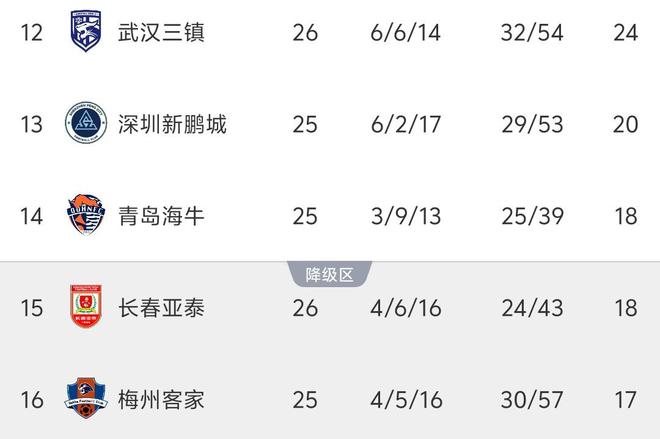 最新积分榜方面,倒数的3支球队排名没有发生变化,海牛和亚泰同积18分,海牛凭借着相互战绩以及净胜球的优势,力压对手排在第14位,亚泰则仍旧排在倒数第2,梅州客家17分仍旧垫底。